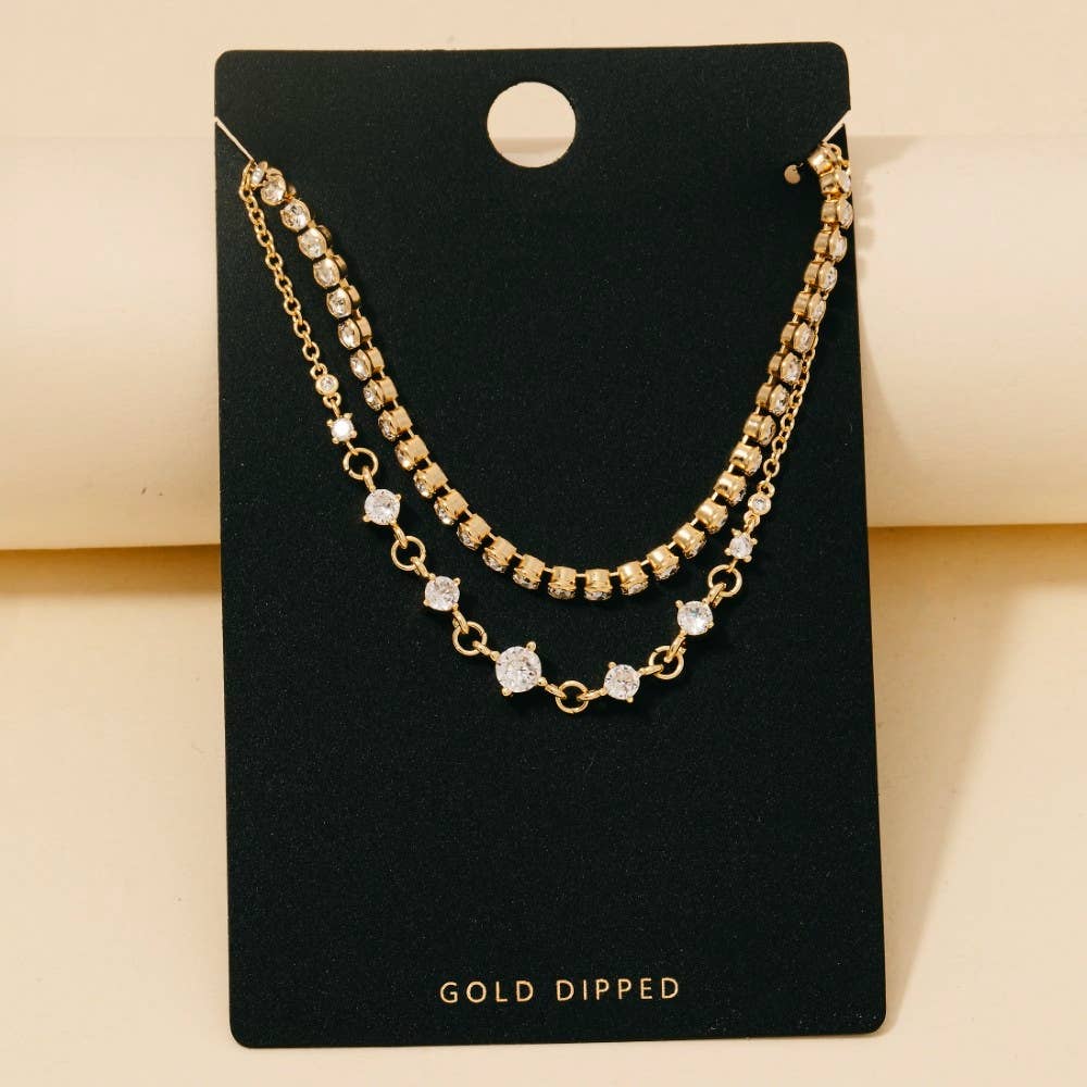 Gold Dipped Round Cz Gems And Chain Layered Necklace