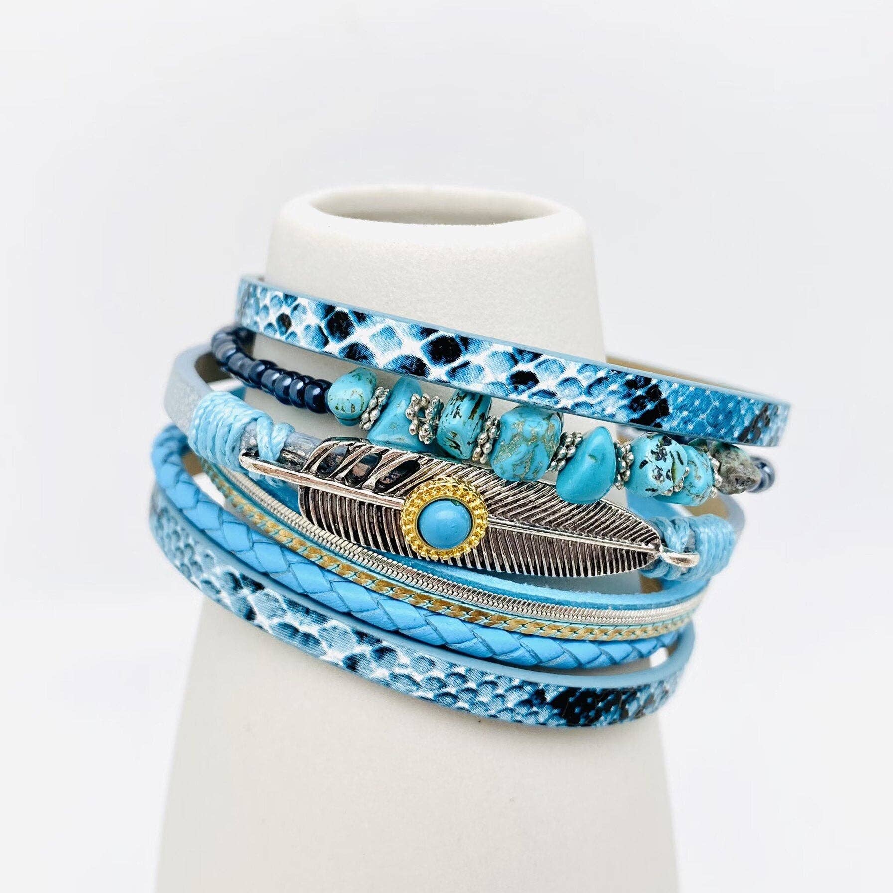 Metal Feather Charm Gravel Woven Leather Bracelet - BJ/LB