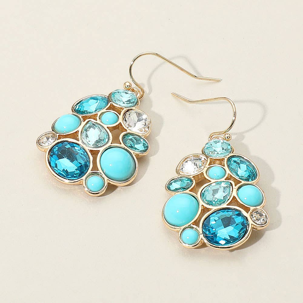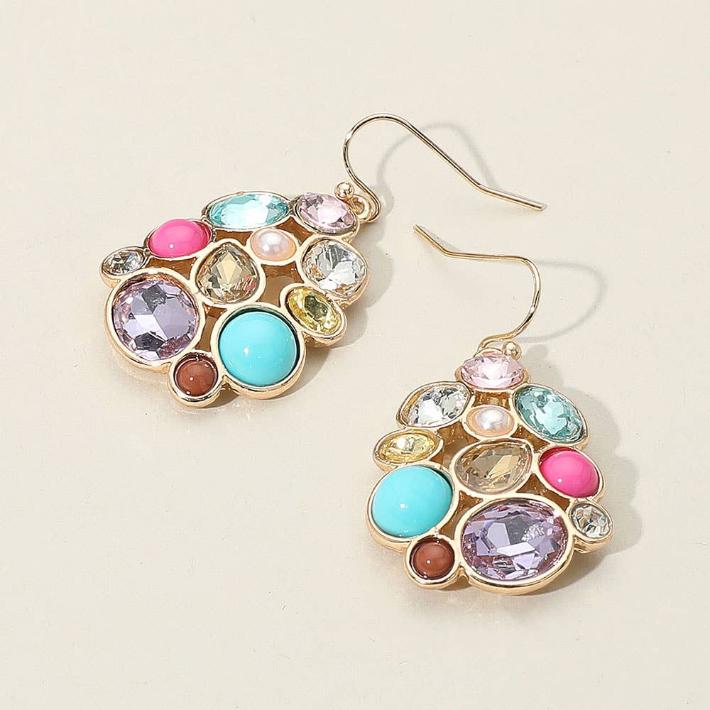 Stylish drop earrings featuring mixed stones in a polished setting. A perfect accessory to enhance both everyday outfits and special occasion looks with a touch of elegance and sparkle. Lightweight and designed for all-day wear.