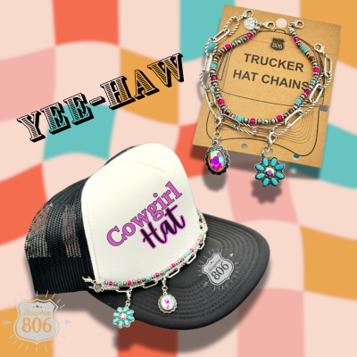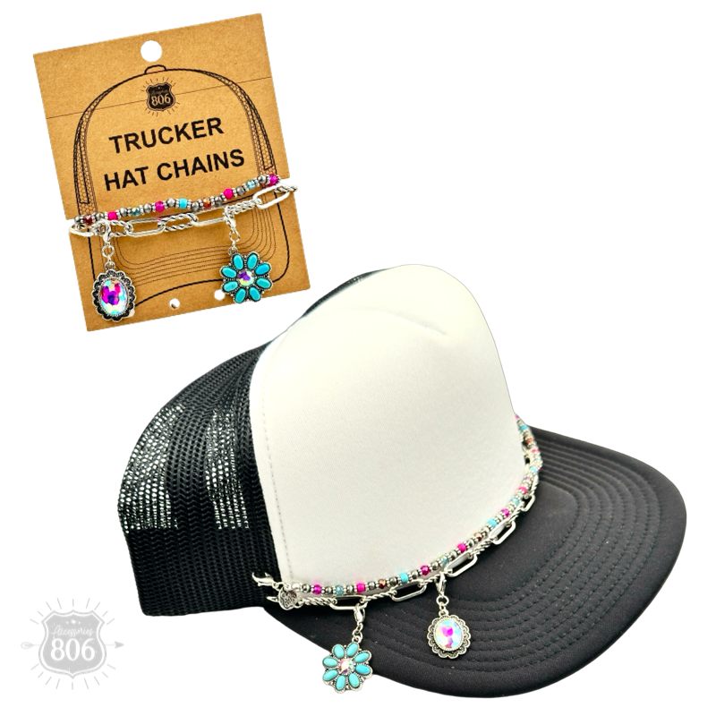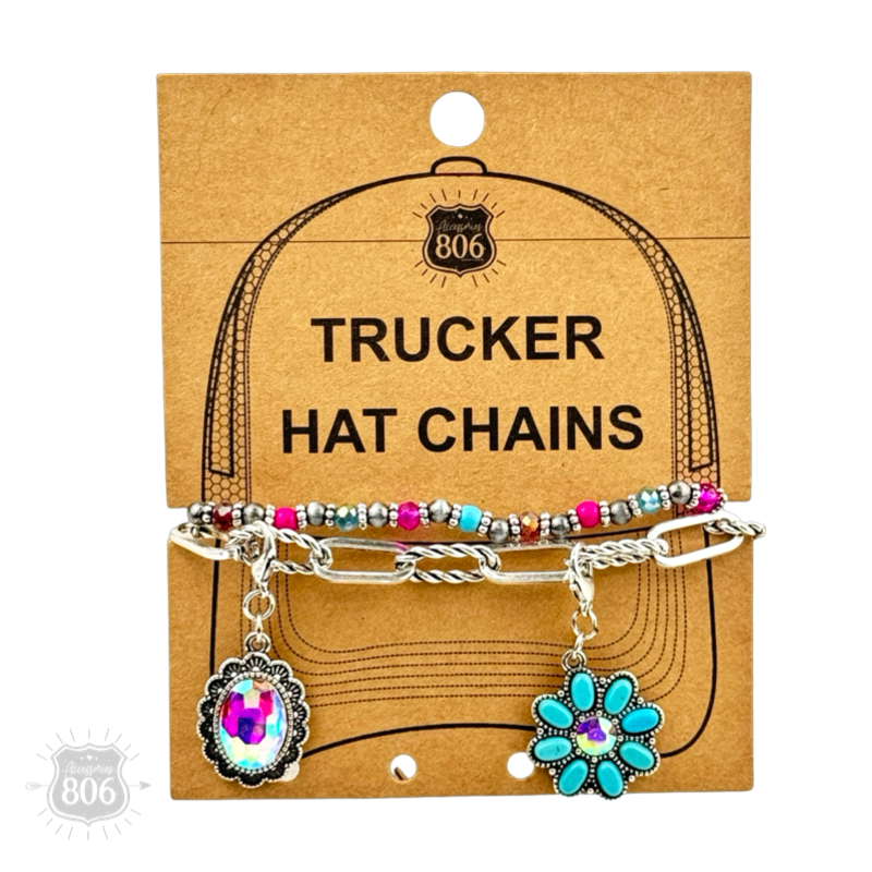 This trucker hat chain has a stand of chunky silver chain and one of multi-color beads. There are rhinestone charms and lobster clasps on either side to hook onto a cap. * Chunky chain * Multi-color beads and rhinestone charms * Fits most trucker hats