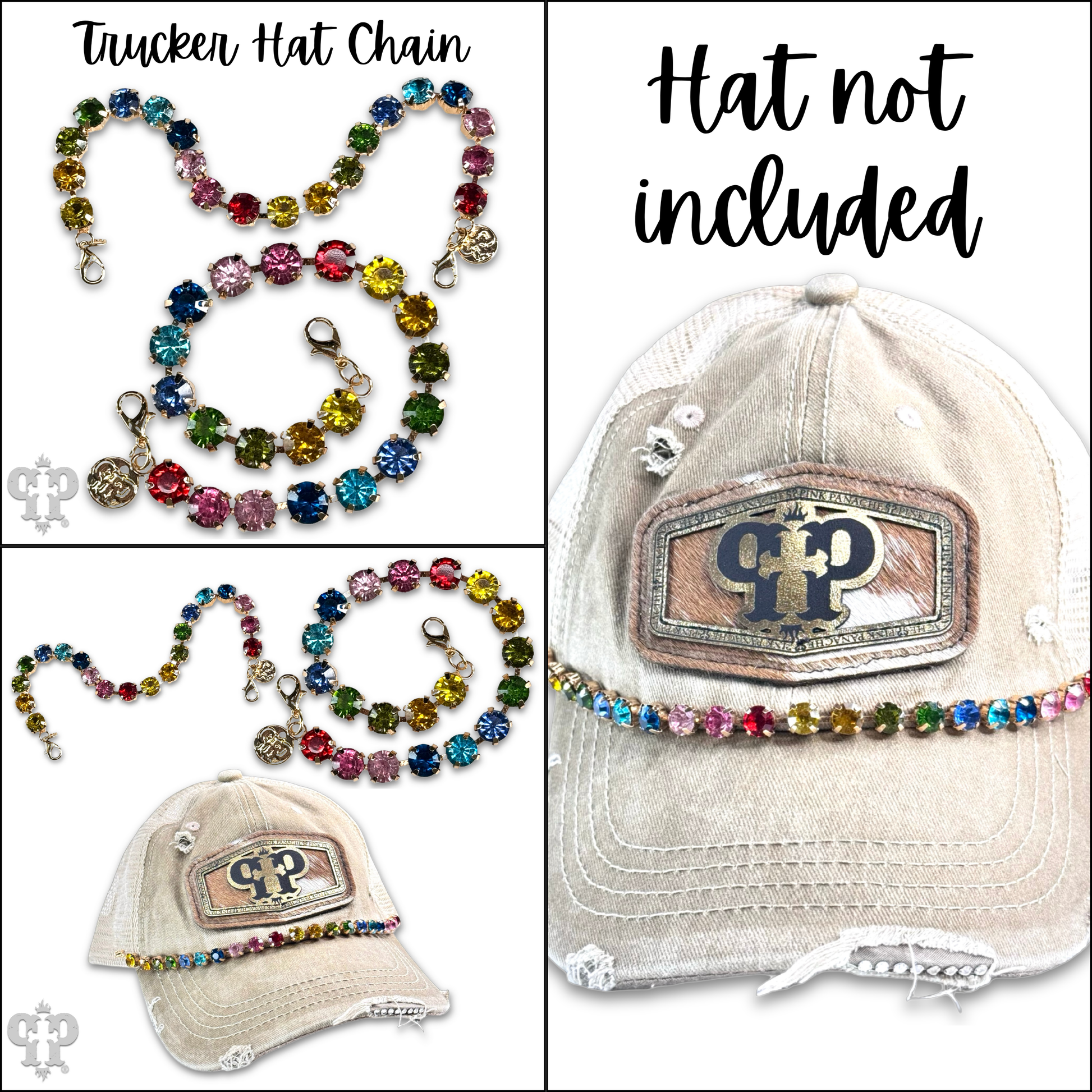 This trucker hat chain has a multi-color prong set rhinestones. It has lobster clasps on either side to hook onto a cap.