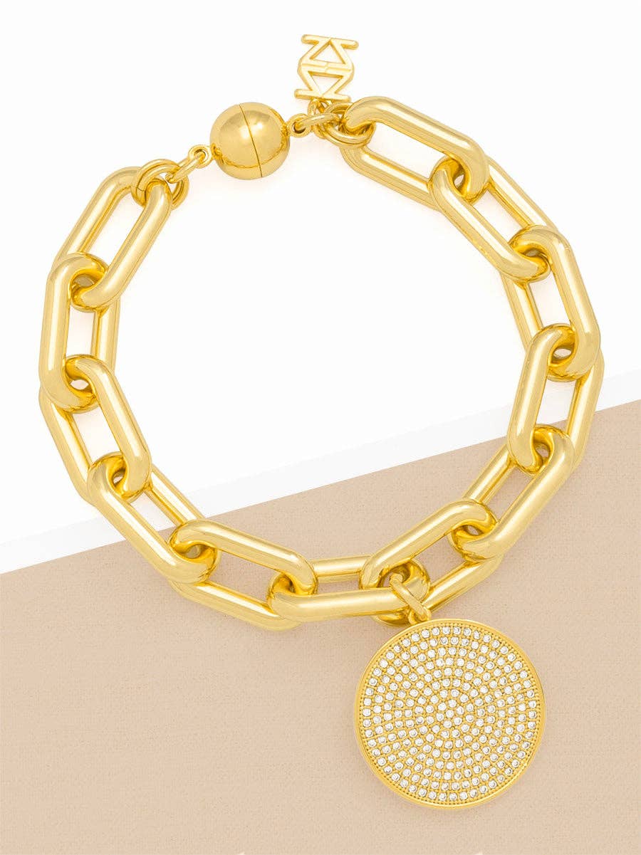 Link bracelet plated in 18K gold with a pavé-set disc charm and magnetic closure.