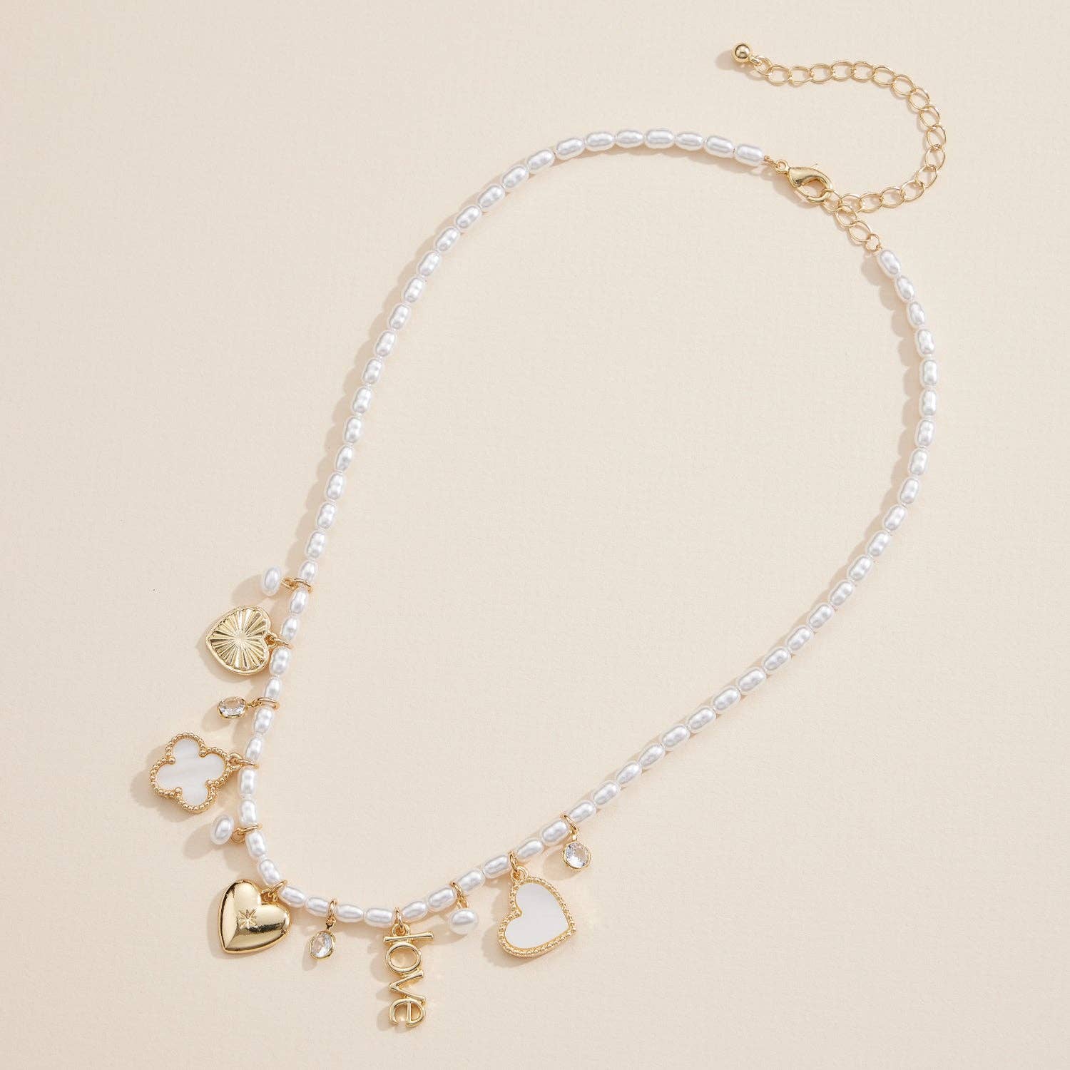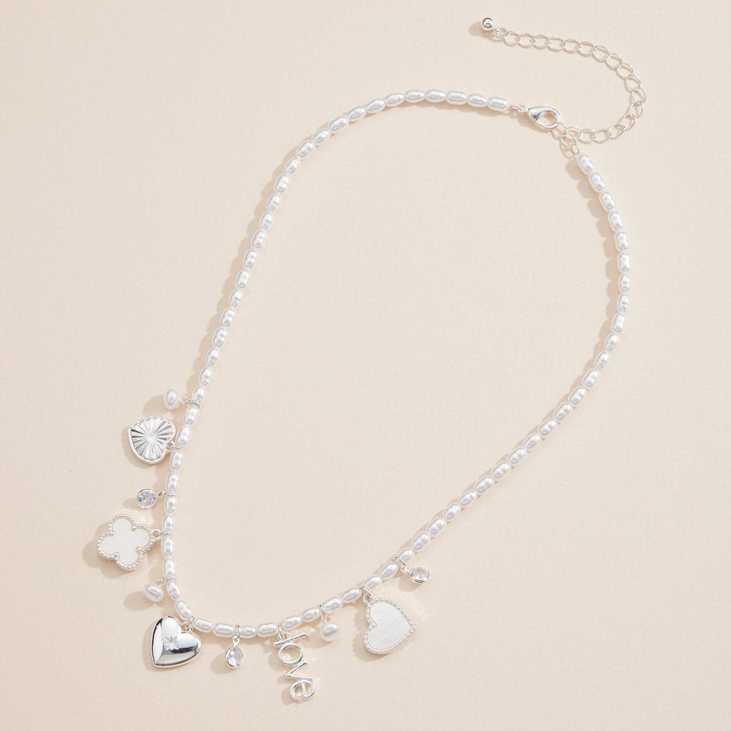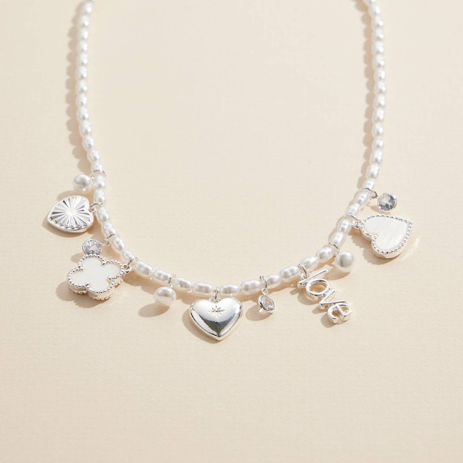 Elevate your style with this stunning pearl charm necklace, featuring delicate freshwater pearls paired with chic gold or silver accents. Adorned with a mix of meaningful charms, including a "Love" pendant, heart-shaped charms, a floral quatrefoil, and sparkling crystal details, this necklace embodies elegance and sentiment. The adjustable clasp ensures a perfect fit, making it an ideal accessory for both special occasions and everyday wear. A beautiful gift for her that celebrates love and timeless beauty.