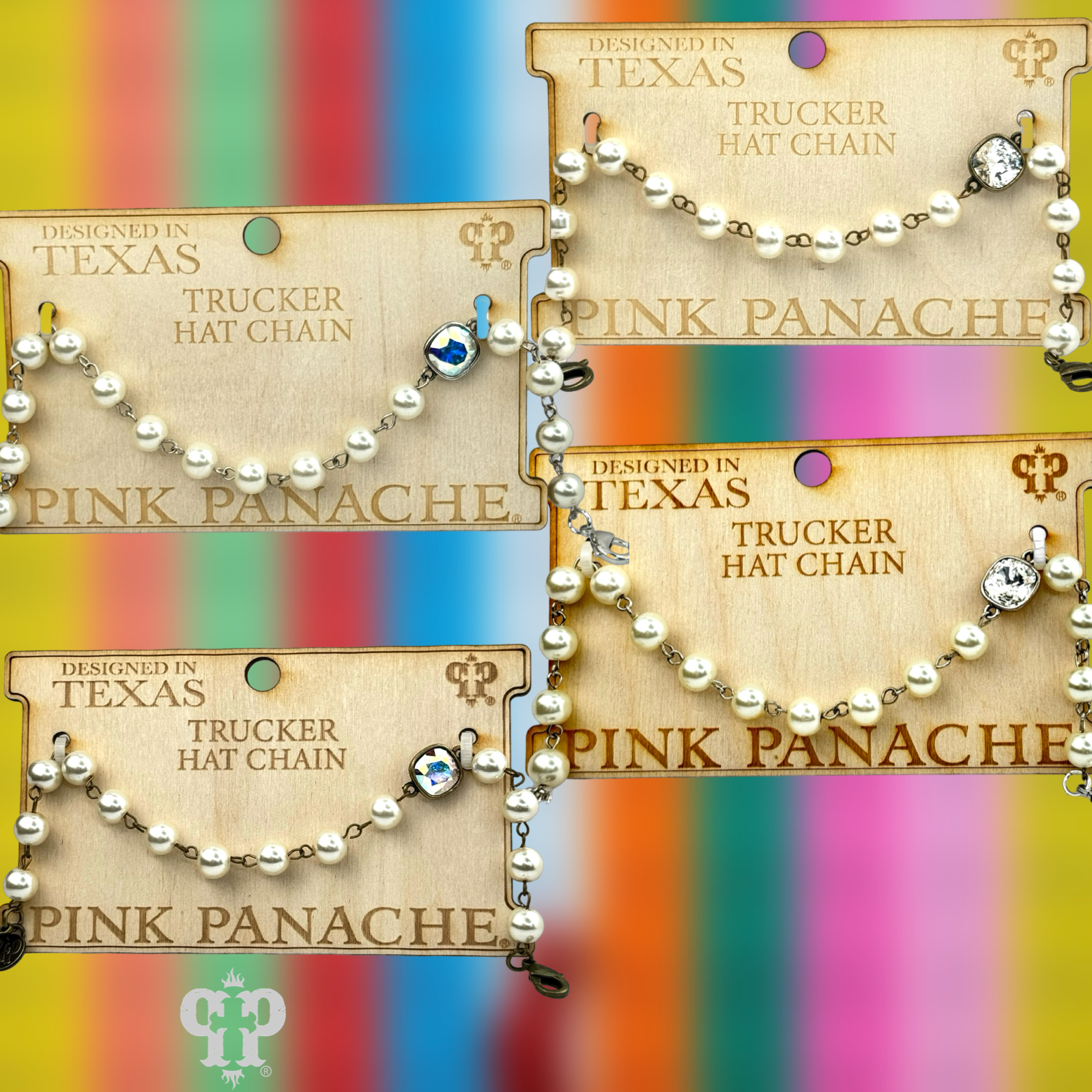 Dress up the trucker hat with this 6mm linked bead chain featuring a 10mm Austrian crystal connector in a setting custom made for us. Approximately 10.5 inches in length and should fit most trucker hats and caps.