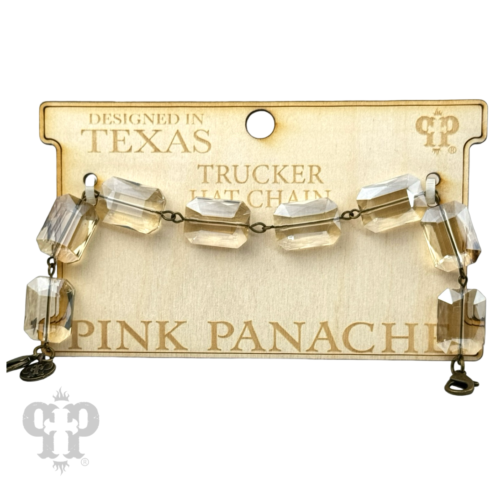 Dress up the trucker hat with these faceted large rectangle shape crystals linked into a chain. The lobster clasp on either end make it easy to change them out with other chains.