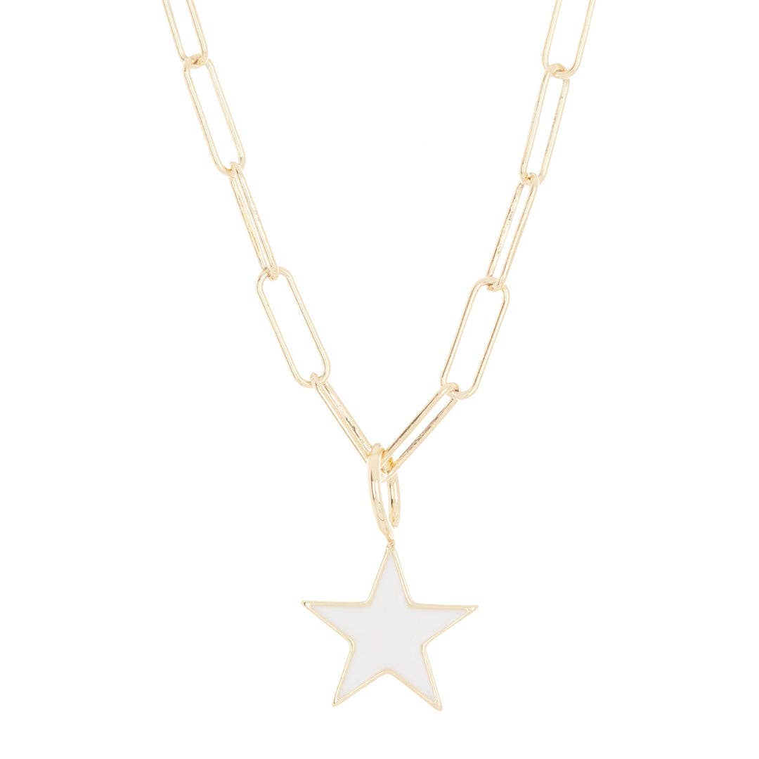 * White enamel star necklace, white enamel star charm, paper clip star pendant necklace, white drop star pendant necklace, gold paper clip chain pendant necklace, big large gold star pendant necklace, oval link necklace charm, gold paper clip drop charm pendant necklace